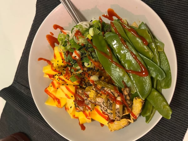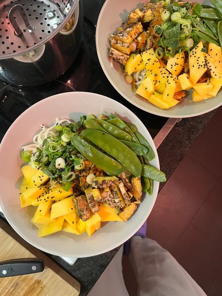 Noodles Tofu Tempeh Snap peas Mango Carrots and parsnips Green onions Mint